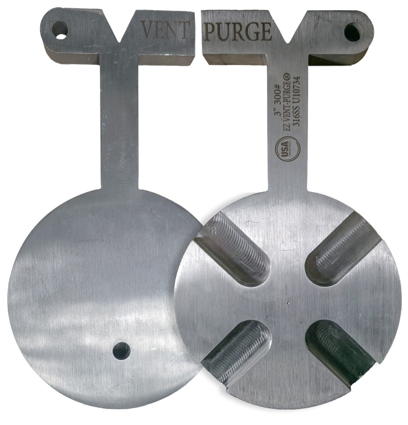 Our EZ Vent-Purge blinds are stamped with the line size, flange rating, and the word "VENT" on the vented side, and "PURGE" on the purge side.